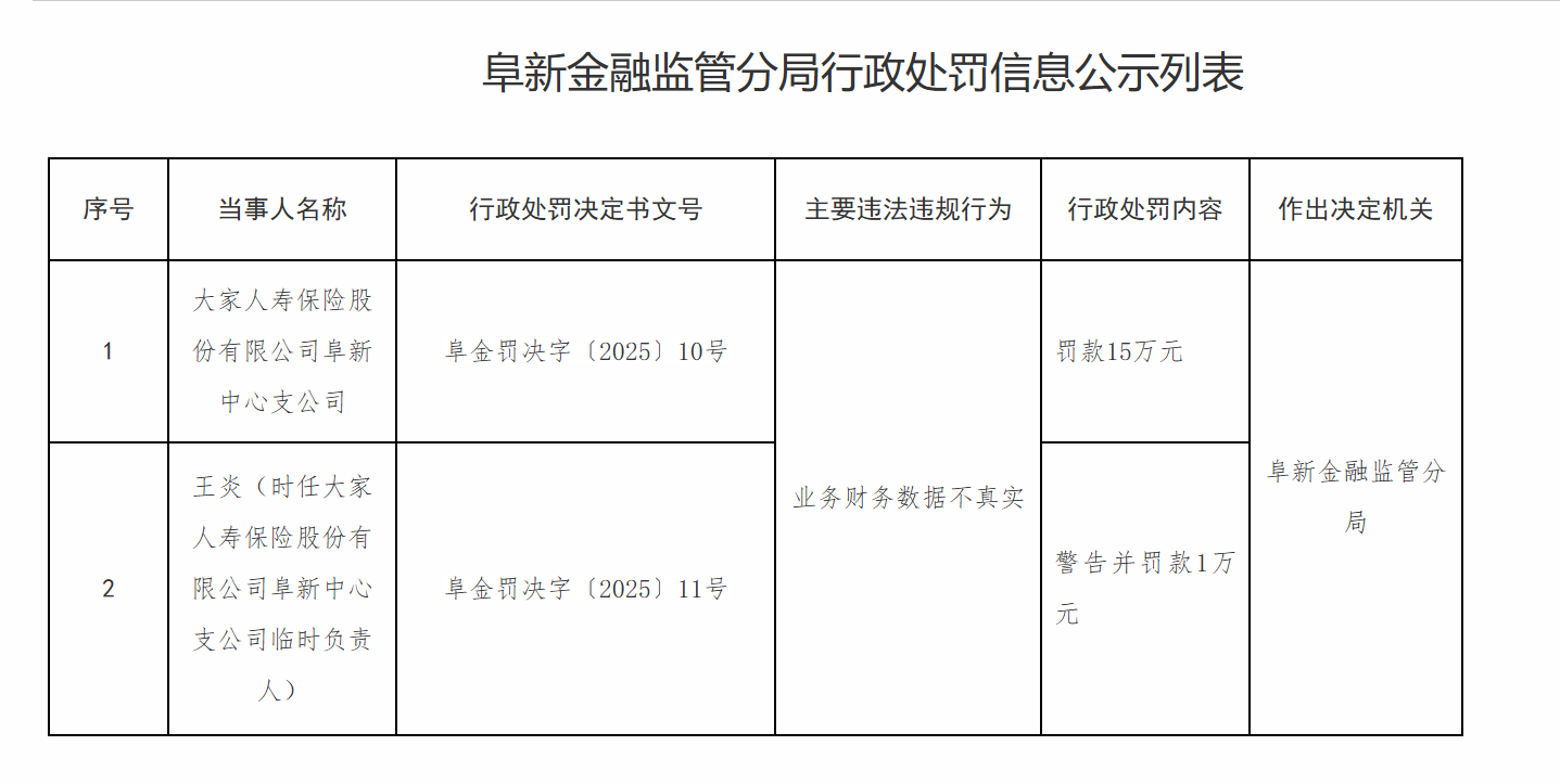 11月25日,阜新金融监管分局行政处罚信息公示列表显示,大家人寿保险股份有限公司阜新中心支公司因业务财务数据不真实被罚款15万元;王某被警告并罚款1万元。