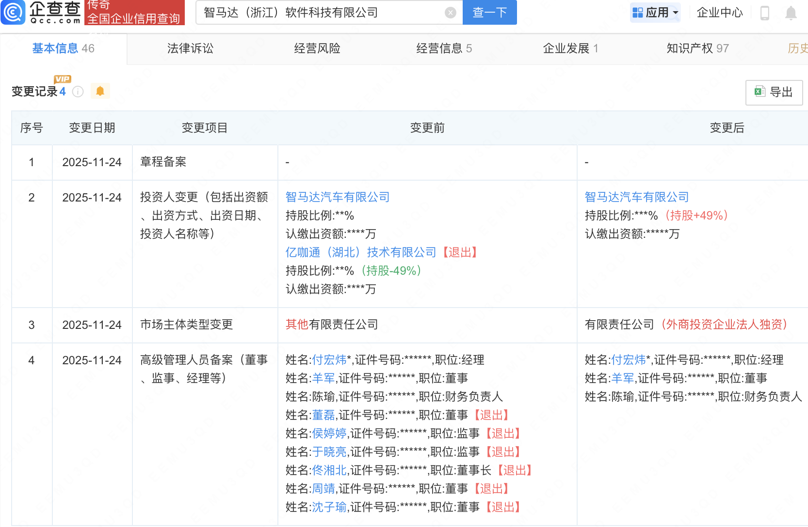 近日,智马达(浙江)软件科技有限公司发生工商变更,亿咖通(湖北)技术有限公司退出股东行列,退出前持股49%,smart汽车关联公司智马达汽车有限公司股份升至100%,同时,多名高管退出。企查查信息显示,该公司成立于2023年,注册资本1亿元,经营范围包含:汽车零部件及配件制造;电子元器件制造;汽车零配件批发;汽车零配件零售等。公开信息显示,此前,亿咖通科技携手smart,共同宣布成立智马达软件科技有限公司,通过该公司,亿咖通科技与smart将打通并优化整车与智能化技术的研发生态、流程体系、采购体系和优质供应链,团结整车开发与融合智能化技术人才。